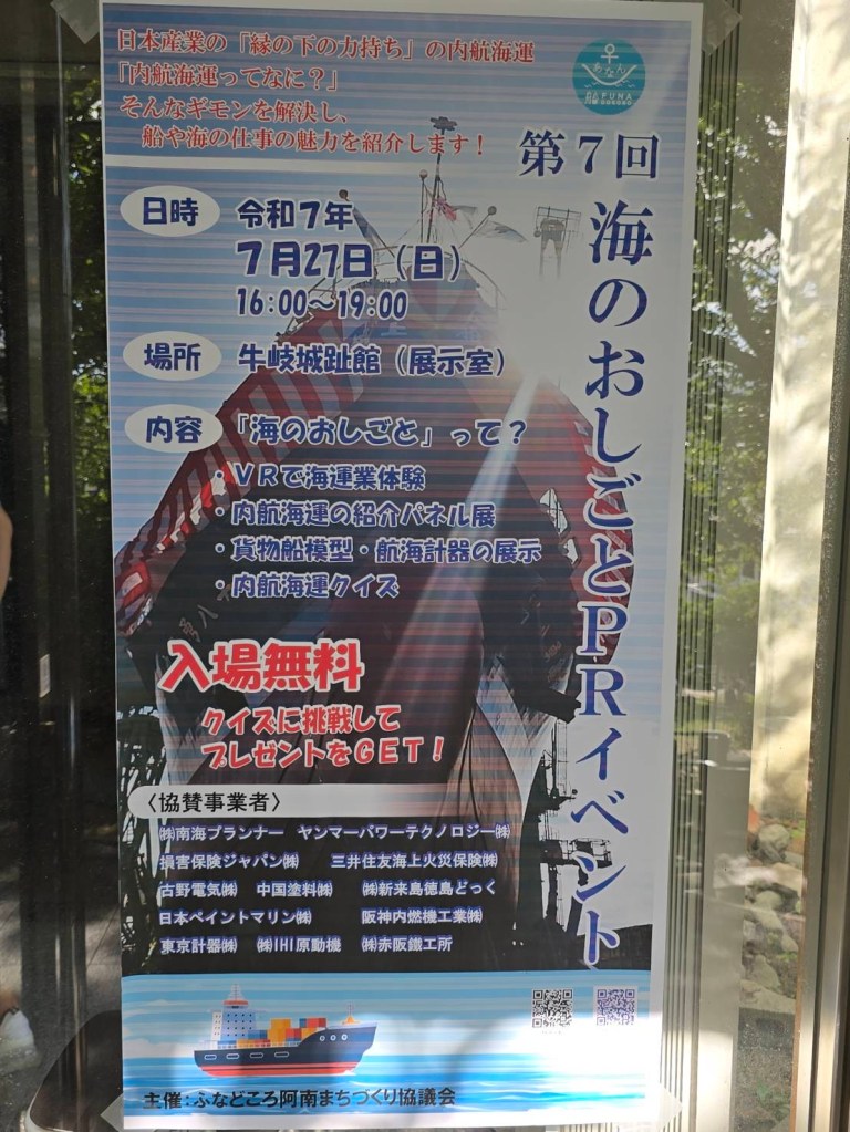 お久しぶりです、バタバタしていて更新ができてなかったことを今築きました。先月の話なのですが7/27に阿南の夏祭りで海のお仕事PRイベントをふなどころ阿南まちづくり協議会で開催しました。今年の目玉は、内航総連からお借りしたVRゴーグルによる疑似体験です、瀬戸大橋通過と飛び込み体験ができます。